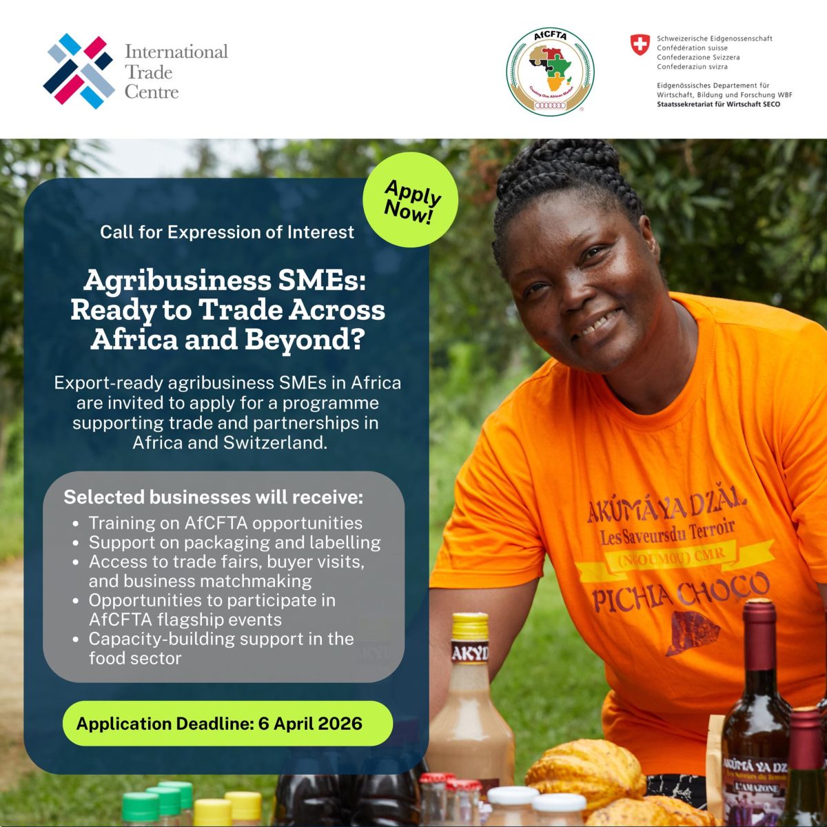 The programme also promises capacity-building support in the food sector, giving agribusiness enterprises a chance to improve their readiness for formal trade and build stronger links with regional and international markets. The poster further indicates that the initiative is designed to support trade and partnerships in Africa and Switzerland.