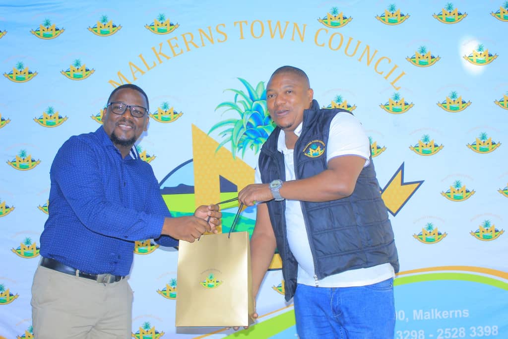 (L-R) Bongani Mvubu from Malkerns Research Station receiving a token of appreciation from Malkerns Town Council Officer.